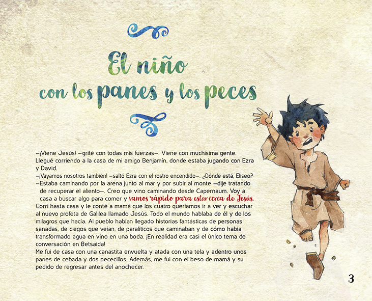In this story, a boy tells us how he shared his food with Jesus, who miraculously multiplied it, and more than five thousand people were fed and twelve baskets full were left over.